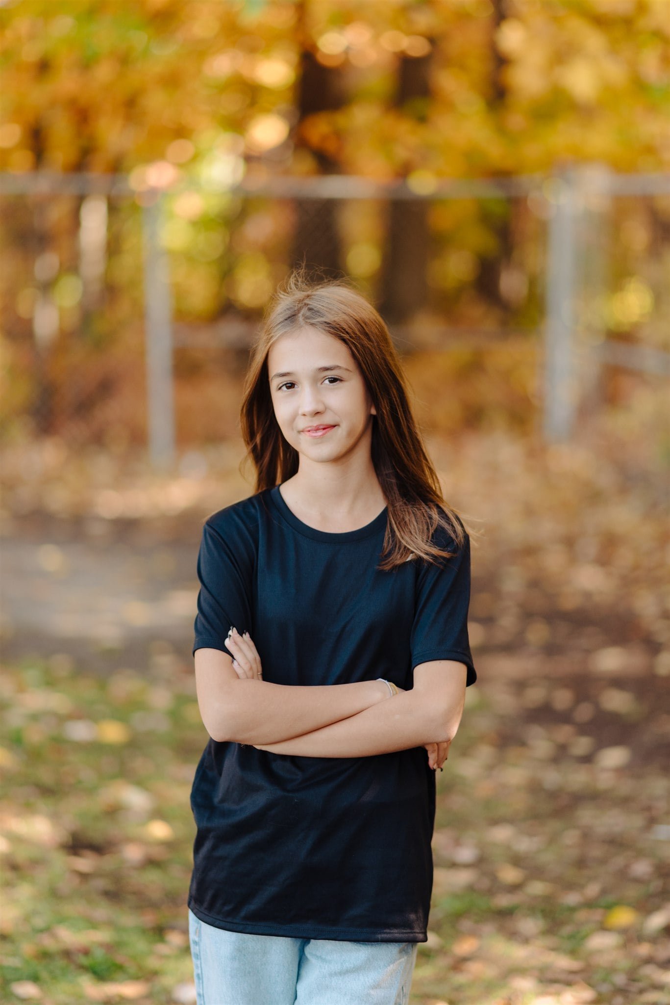 Un garçon souriant en tenue décontractée dans un parc en automne, dans un style de photographie scolaire réalisée par des photographes au Québec.