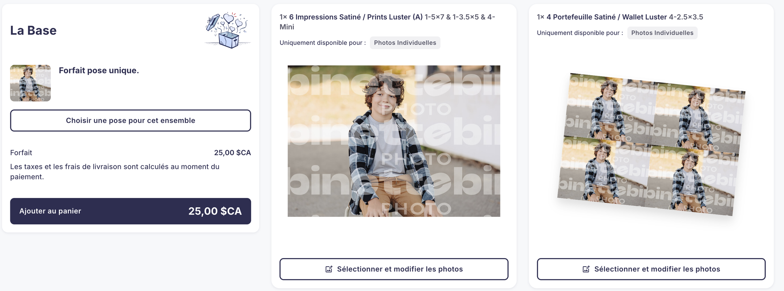 Cliquez sur un forfait pour voir exactement ce qu’il comprend, incluant les formats, les quantités et les photos incluses.